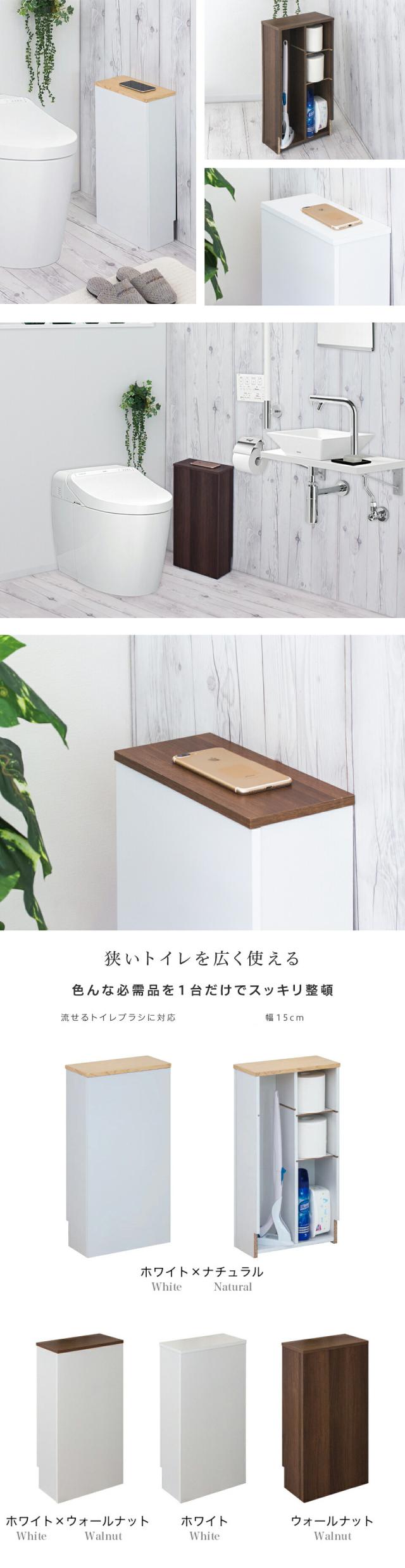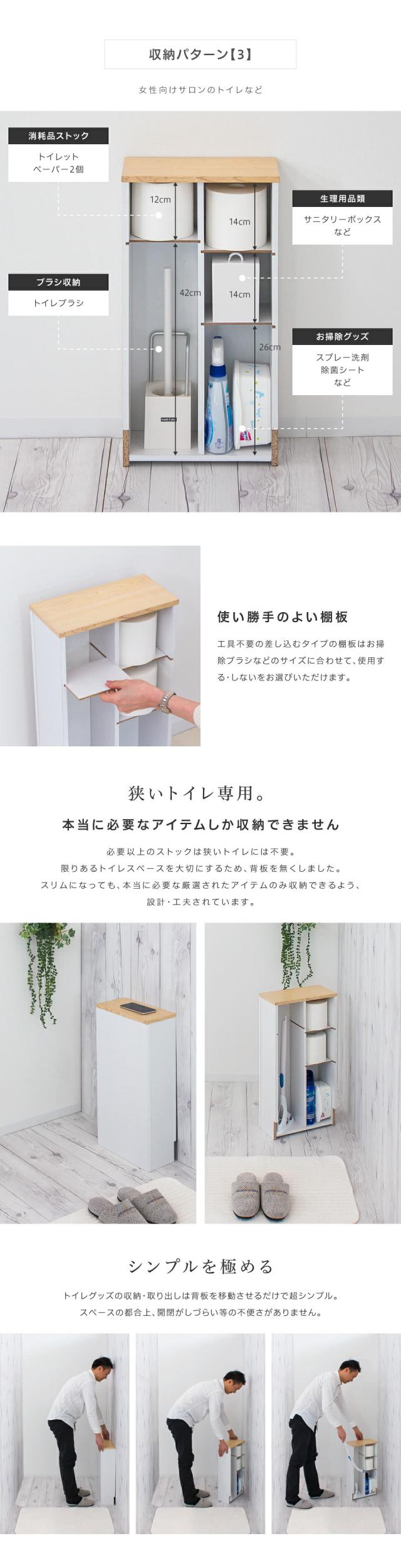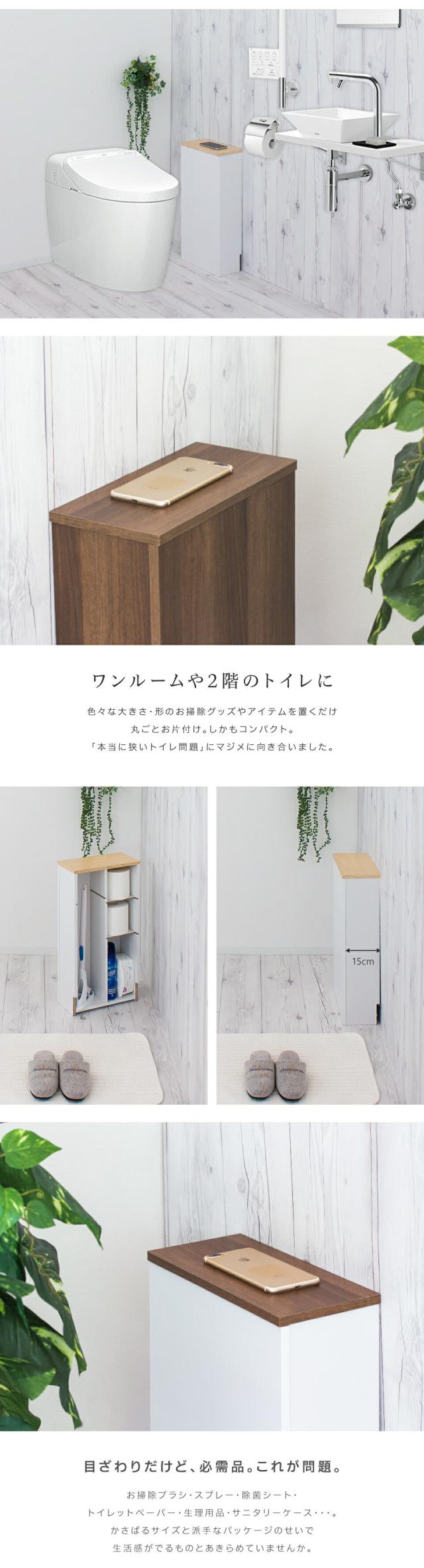 | 狭いトイレを広く使える 色んな必需品を1台だけでスッキリ整頓 流せるトイレブラシに対応 幅15cm ワンルームや2階のトイレに 色々な大きさ・形のお掃除グッズやアイテムを置くだけ 丸ごとお片付け。しかもコンパクト。「本当に狭いトイレ問題」にマジメに向き合いました。 目ざわりだけど、必需品。これが問題。 お掃除ブラシ・スプレー・除菌シート・トイレットペーパー・生理用品・サニタリーケース・・・。かさばるサイズと派手なパッケージのせいで生活感がでるものとあきらめていませんか。 オールインワンでサクッと解決 色々な大きさ・形のお掃除グッズやアイテムを置くだけ 丸ごとお片付け。しかもコンパクト。ワンルームや2階のトイレも広々使えます。 今、人気の流せるトイレブラシのユーザー 女性向けサロンのトイレなど ブラシ収納:流せるトイレブラシ 消耗品ストック:トイレットペーパー お掃除グッズ:流せる替えブラシ、消臭スプレー、スプレー洗剤など 生理用品類:サニタリーボックスなど 使い勝手のよい棚板 工具不要の差し込むタイプの棚板はお掃除ブラシなどのサイズに合わせて、使用する・しないをお選びいただけます。 狭いトイレ専用。本当に必要なアイテムしか収納できません。 必要以上のストックは狭いトイレには不要。限りあるトイレスペースを大切にするため、背板を無くしました。スリムになっても、本当に必要な厳選されたアイテムのみ収納できるよう、設計・工夫されています。 シンプルを極める トイレグッズの収納・取り出しは背板を移動させるだけで超シンプル。 スペースの都合上、開閉がしづらい等の不便さがありません。 スマホやお財布などを天板にチョイ置きできます。 スッキリの効果を検証 空間に広がりが バラバラの大きさ・種類のアイテムを1つの収納ボックスにおさめることで、雑然としたトイレがスッキリとした空間に。スマホなどを仮置きできるスペースも生まれました。 天板は自然な風合いのプリント仕上げ 背板は幅木除けカットでピッタり壁付けできます。 |