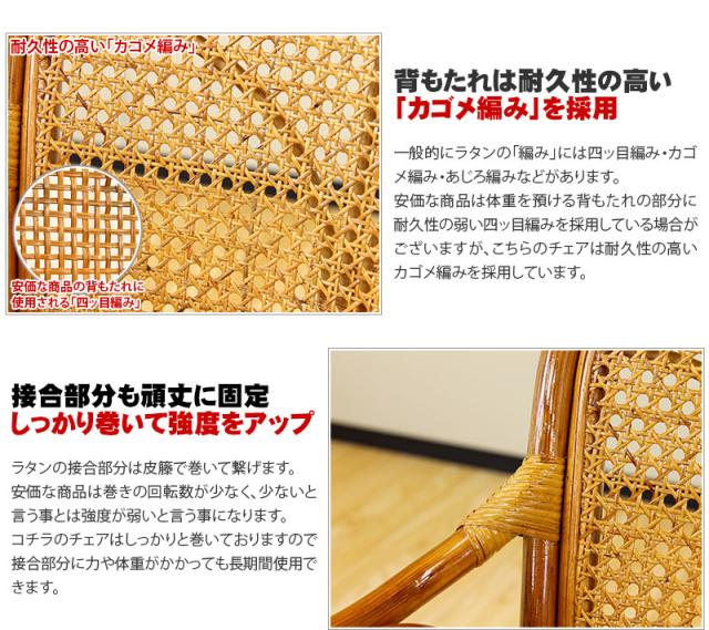 量販店にある様な安価商品にはラタンの背面などにささくれ(バリ)が残っている場合がありますが弊社は手作業でささくれ(バリ)のカットを行なっていますので手で触れた時チクチクしません。