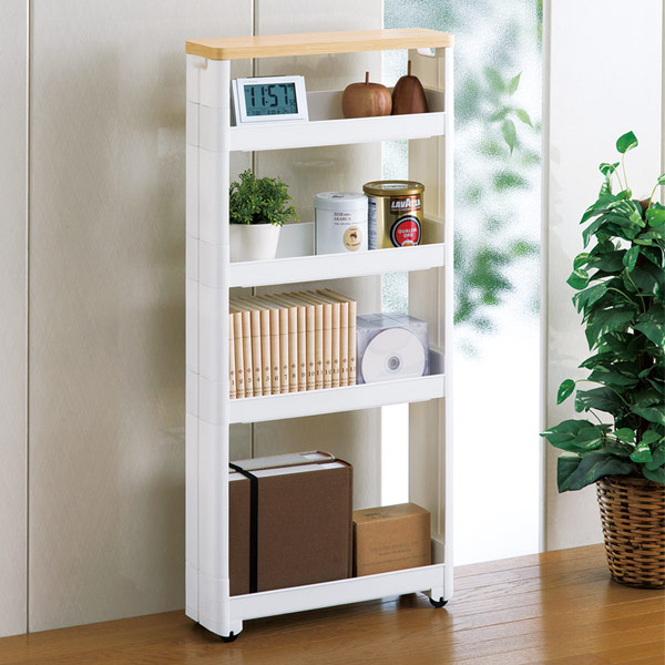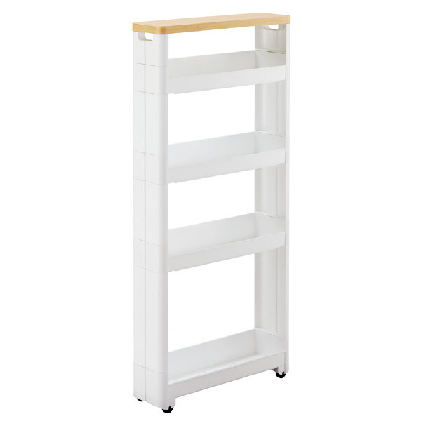 ●どこにでもある、わずかなデッドスペースをすっきり&たっぷり小物収納にできるスリムワゴンです。●ご自宅の家具に合わせて、幅や奥行き、高さなどサイズが選べます。●幅わずか12.5cm!とてもスリムな収納ワゴンです。●奥行は45cmで、食器棚横などに最適です。●5段ラックの上段は木製天板タイプとなっており、木のぬくもりを感じられるフラットで使いやすい、スタイリッシュなデザインです。●サイドオープンタイプなので、左右どちら側からでも取り出すことができます。●壁面にぴったりくっつけて使用すれば、キッチン以外でもリビングなどでオープンラックとして使用できます。●側板が目隠しとなり、たっぷり収納してもスッキリ見えます。●まっすぐ動くコロ付きなので、引き出しの感覚で出し入れできます。●差し込み式の簡単組立です。サイズ約 幅12.5×奥行45×高さ97.4(cm)材質本体/ポリプロピレン天板/プリント化粧パーチクルボードカラーホワイト生産国日本備考組立式【耐荷重】天板/3kg以下、上段/4kg以下、中段(上)/4kg以下、中段(下)/6kg以下、下段/10kg以下総合計/27kg以下※変形や転倒の危険がありますので、一部に荷重がかかりすぎないよう、平均して乗せるようにしてください。※熱による変形の恐れがありますので、ストーブ等の近くでは使用しないでください。幅わずか12.5cm!ちょっとした隙間を小物収納庫に