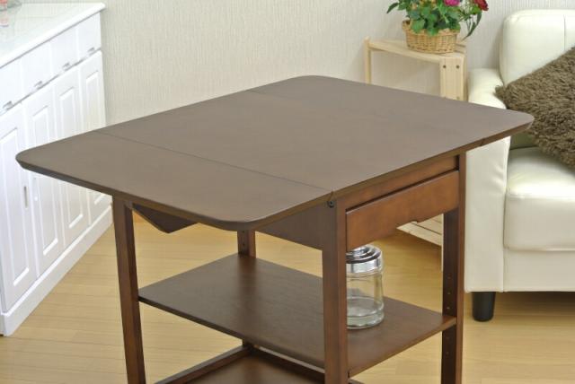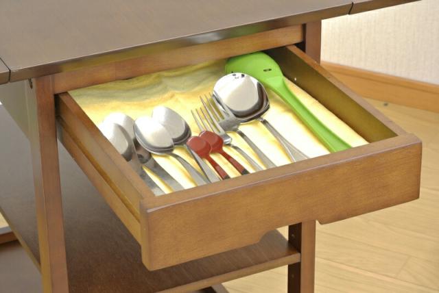 | ●キッチン廻りの小物の整理整頓ができテーブルを広げれば作業台にもなります。●小物の収納に便利な引出付です。●キャスター付なので移動が楽です。●耐荷重:天板…約10kg、バタフライ天板…約2kg、引出…約2kg、棚板1段当り…約2kg |