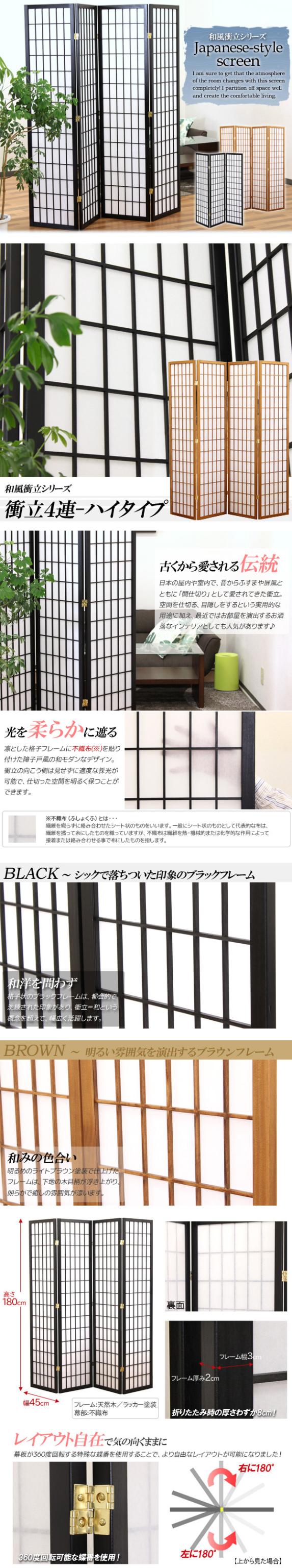 和風衝立 スクリーン 高さ180cm 4連 黒ブラック茶ブラウン 木製 ハイタイプ アジアン 和風 おしゃれ パーテーション 木製パーティション パテーション シェード 自立 間仕切り こだまひかり インテリア 家具【送料込み】新生活 助成金 補助金 給付金