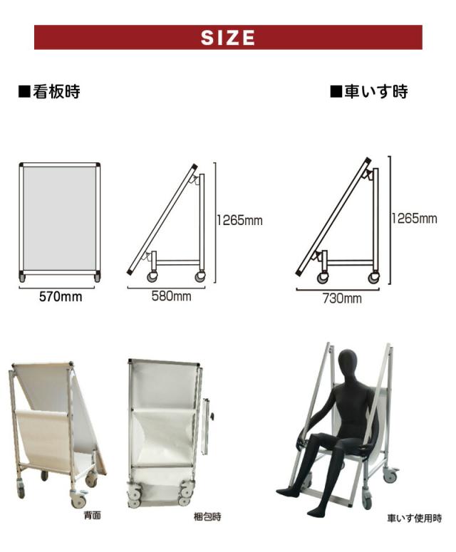 | 普段は看板としてお使いいただき、いざと言う時には病人や物資を運べる車いすに変換できるすぐれもの。店頭にあると安心の看板です。 |