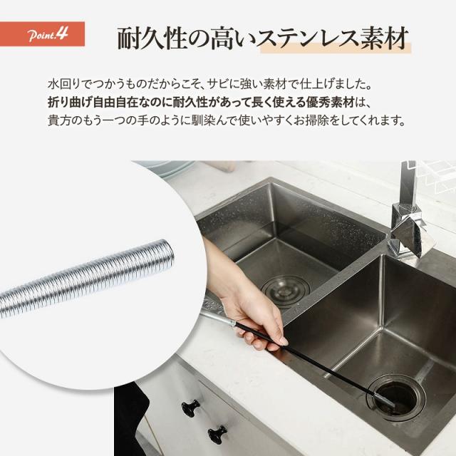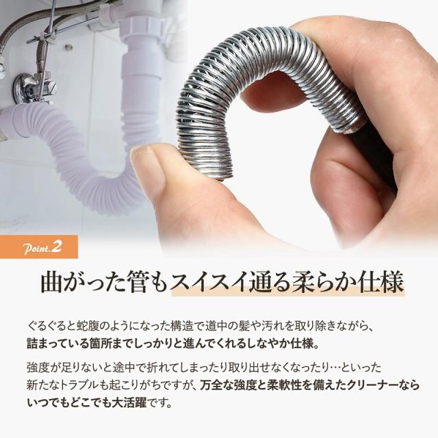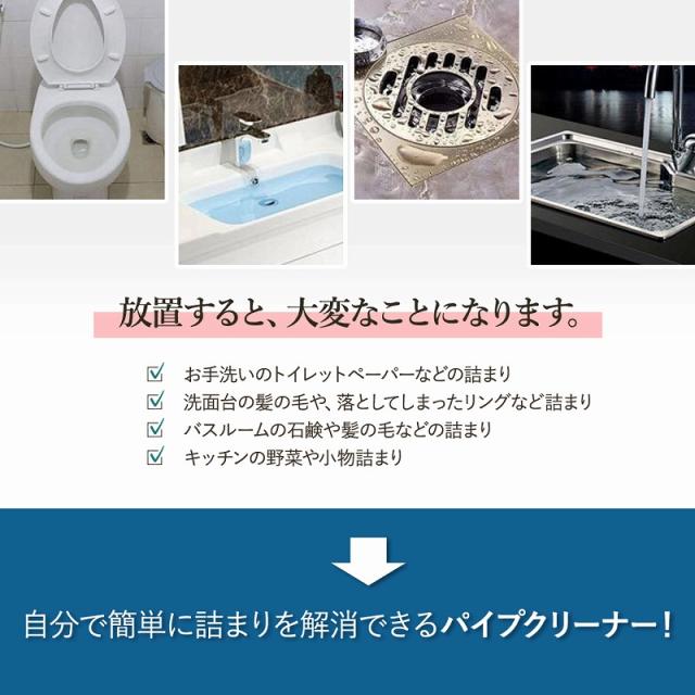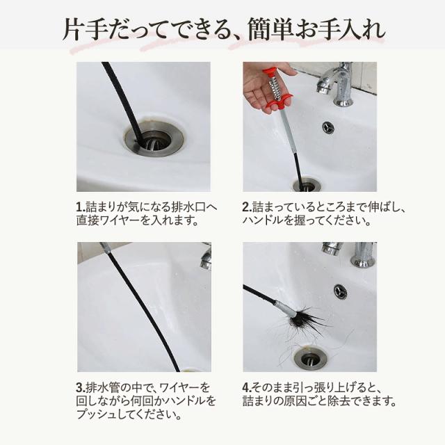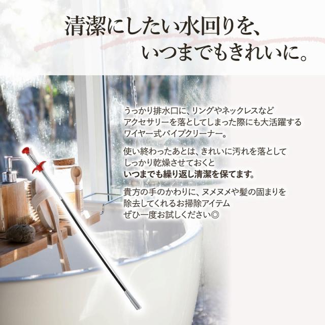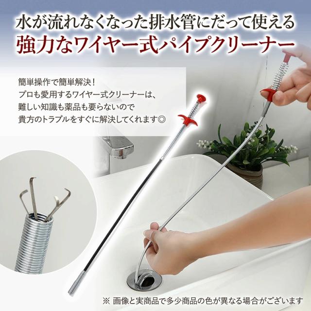| 商品の説明 | お風呂の排水溝や、キッチンや洗面台。 トイレの詰まりなど。 できることなら触りたくない、ヌメヌメや髪の毛づまりをきちんとお手入れできていますか? 放置してしまうとニオイや酷い詰まりの原因となってしまうので、できることならスグに直接触らずなんとかしたいですよね。 きれいにしているつもりでも、誰だって詰まってしまういやなものが排水口の詰まり。 解けたタンパク質が髪の毛を絡めてしまい、頑固な固まりとなって排水口を塞いでしまうんです。 そんなイヤ〜な固まりをすぐに取り除いてくれるのが、片手で簡単に操作できるパイプクリーナー! 簡単操作で簡単解決! プロも愛用するワイヤー式クリーナーは、難しい知識も薬品も要らないので貴方のトラブルをすぐに解決してくれます◎ 先端についた4本のツメがしっかりキャッチ! 手元のレバーを押し込むと、先端のツメが飛び出し離すともとに戻ります。 簡単に片手で操作できるから、細々としたものが多いキッチンやお風呂場だって一人で簡単お掃除可能。 曲がった管もスイスイ通る柔らか仕様。 ぐるぐると蛇腹のようになった構造で道中の髪や汚れを取り除きながら、詰まっている箇所までしっかりと進んでくれるしなやか仕様。 強度が足りないと途中で折れてしまったり取り出せなくなったり、といった新たなトラブルも起こりがちですが、万全な強度と柔軟性を備えたクリーナーならいつでもどこでも大活躍です。 どんなに優秀でも、太すぎて入らないワイヤーだと詰まりは解消できません。 無駄を削ぎ落とし、優秀な性能の部品を使ったパイプクリーナーだからこそ、スマートなサイズ感を実現しました。 手強い詰まりだって、業者いらずでコストをかけずに即解決! 水回りでつかうものだからこそ、サビに強い素材で仕上げました。 折り曲げ自由自在なのに耐久性があって長く使える優秀素材は、貴方のもう一つの手のように馴染んで使いやすくお掃除をしてくれます。 1.詰まりが気になる排水口へ直接ワイヤーを入れます。 2.詰まっているところまで伸ばし、ハンドルを握ってください。 3.排水管の中で、ワイヤーを回しながら何回かハンドルをプッシュしてください。 4.そのまま引っ張り上げると、詰まりの原因ごと除去できます。 いつでもどこでも、水回りのお悩みを解決してくれるご家庭に1つは欲しいベストサイズのアイテムです。 うっかり排水口に、リングやネックレスなどアクセサリーを落としてしまった際にも大活躍するワイヤー式パイプクリーナー。 使い終わったあとは、きれいに汚れを落としてしっかり乾燥させておくといつまでも繰り返し清潔を保てます。 貴方の手のかわりに、ヌメヌメや髪の固まりを除去してくれるお掃除アイテムぜひ一度お試しください◎ |