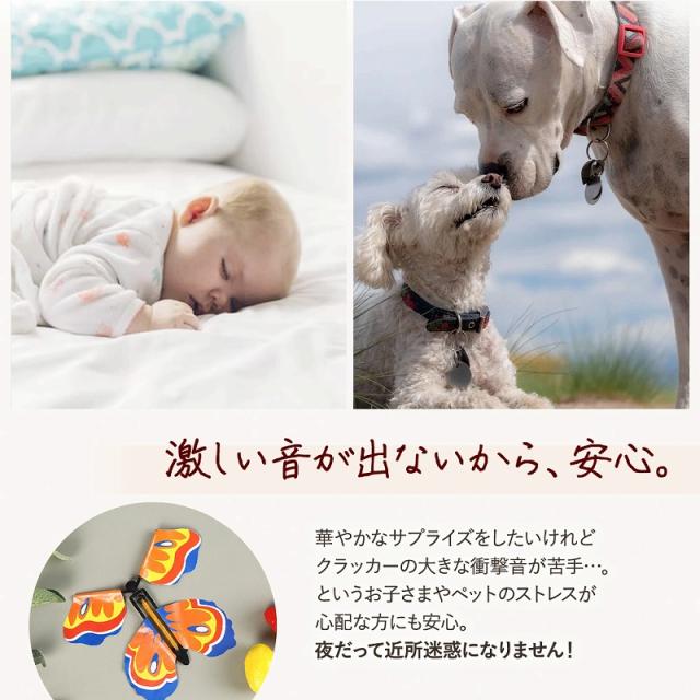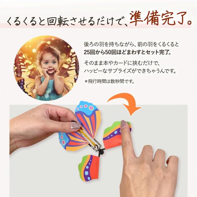 | 商品の説明 | ご時勢柄、なかなか外出もできずおうち時間でやれることはやりつくした…。 そんなお悩みを抱えていませんか? 簡単かつ低コストで、とびきりのサプライズが出来る今大人気の飛び出す贈り物があります。 ちょっとしたパーティやいろんな催し、たのしいおもちゃとしてもマルチに使える幻想的なおもちゃをご紹介します。 贈り物のカードや、いつも読んでいる絵本。 ページをめくるとカラフルでキレイな色彩のバタフライが、魔法にかかったようにパタパタと飛び出します。 お得な10個セットでお届け。 羽の色味はランダムですので、お選びいただけません。 掲載画像以外の模様や色の蝶々がお届けされる場合もございます。 華やかなサプライズをしたいけれどクラッカーの大きな衝撃音が苦手…。 というお子さまやペットのストレスが心配な方にも安心。 夜だって近所迷惑になりません! 後ろの羽を持ちながら、前の羽をくるくると25回から50回ほどまわすとセット完了。 そのまま本やカードに挟むだけで、ハッピーなサプライズができちゃうんです。 *飛行時間は数秒間です。 誕生日を素敵にお祝いするだけでなく、ちょっと元気がない日の励ましにも。 みんなが素敵に楽しめる、とっておきのサプライズを贈ってみませんか。 海外でも大人気のフライングバタフライ。 いま人気のアニメや漫画でも蝶々舞わせるシーンを再現できたりと、幅広い楽しみ方もできます。 ぜひ、親子皆で楽しんでくださいね◎ |