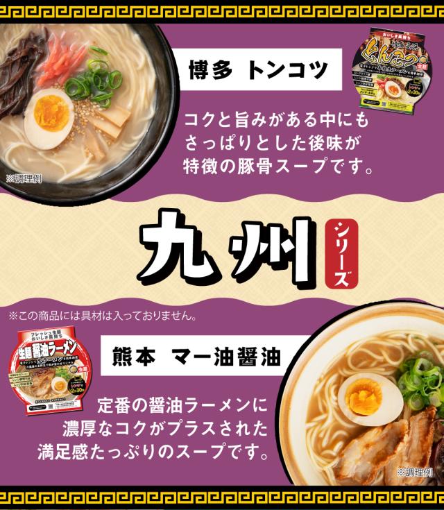 ■北海道2種(味噌・黄金塩)食べ比べセット 【麺】小麦粉(国内製造)、小麦たん白、食塩/酒精、かんすい、貝Ca、クチナシ色素、(一部に小麦を含む) 【味噌スープ】味噌(国内製造)、米発酵調味料、動物油脂、醤油、砂糖、食塩、にんにく、香辛料、生姜、ごま/調味料(アミノ酸等)、pH調整剤、カラメル色素、(一部に小麦・ごま・大豆・豚肉・ゼラチンを含む) 【塩スープ】食塩(国内製造)、動物油脂、アミノ酸液、砂糖、ビーフエキス、植物油脂、煮干し風味調味料、香辛料、玉葱エキス、野菜香味調味料、乾燥ガラスープ/調味料(アミノ酸等)、酒精、増粘剤(グァーガム、加工澱粉)、酸味料、酸化澱粉、カラメル色素、香料、香辛料抽出物、(一部に乳成分・小麦・ごま・牛肉・大豆・鶏肉・豚肉・りんご・ゼラチンを含む) 【乾燥具材】メンマ(メンマ、デキストリン、砂糖、醤油、食塩)、ネギ(ネギ、ブドウ糖)/調味料(アミノ酸)、酸化防止剤(ビタミンE)、(一部に小麦・大豆を含む) ■九州2種(とんこつ・マー油【醤油】)食べ比べセット 【麺】小麦粉(国内製造)、小麦たん白、食塩/酒精、かんすい、貝Ca、クチナシ色素、(一部に小麦を含む) 【とんこつスープ】畜肉エキス(国内製造)、食塩、ラード、しょうゆ、砂糖、香辛料、ごま油、酵母エキス/調味料(アミノ酸等)、(一部に豚肉・鶏肉・大豆・小麦・ごまを含む) 【醤油スープ】ポークエキス(国内製造)、豚脂、食塩、砂糖、しょうゆ、たん白加水分解物、香辛料、かつおエキス、香味食用油/調味料(アミノ酸等)、加工でんぷん、酒精、カラメル色素、増粘剤(グァーガム)、(一部に小麦・大豆・豚肉を含む) 【乾燥具材】メンマ(メンマ、デキストリン、砂糖、醤油、食塩)、ネギ(ネギ、ブドウ糖)/調味料(アミノ酸)、酸化防止剤(ビタミンE)、(一部に小麦・大豆を含む) ※乾燥具材はとんこつのみ ■ご当地西2種(背脂醤油・ブラック)食べ比べセット 【麺】小麦粉(国内製造)、小麦たん白、食塩/酒精、かんすい、貝Ca、クチナシ色素、(一部に小麦を含む) 【背脂醤油スープ】動物油脂(国内製造)、しょうゆ、食塩、たん白加水分解物、チキン・ポークエキス、ポークエキス、砂糖、甜麺醤、発酵調味料、野菜(にんにく、しょうが)、かつおぶしエキス、煮干エキス、豆板醤/調味料(アミノ酸等)、酒精、カラメル色素、香辛料抽出物、酸化防止剤(V.E)、ビタミンB1、(一部に小麦・ごま・大豆・鶏肉・豚肉を含む) 【ブラックラーメンスープ】醤油(国内製造)、食塩、本みりん、動物油脂、チキンエキス、砂糖、香味食用油、玉ねぎエキス、香辛料、黒にんにくパウダー/調味料(アミノ酸等)、カラメル色素、酒精、増粘剤(キサンタンガム)、香料、酸化防止剤(ビタミンE、ローズマリー抽出物)、(一部に小麦・大豆・鶏肉を含む) 【乾燥具材】メンマ(メンマ、デキストリン、砂糖、醤油、食塩)、ネギ(ネギ、ブドウ糖)/調味料(アミノ酸)、酸化防止剤(ビタミンE)、(一部に小麦・大豆を含む) |