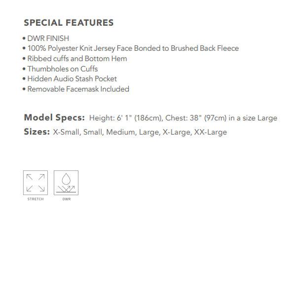 | | Ribbed cuffs and Bottom Hem Thumbholes on Cuffs Hidden Audio Stash Pocket Removable Facemask Included |