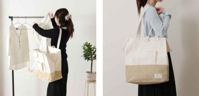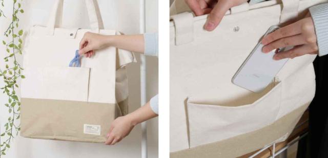 バッグの外側に小ポケットが付いています。洗濯ばさみやスマホ等の小物を収納できます。お出掛けの際の持ち運びに便利です。