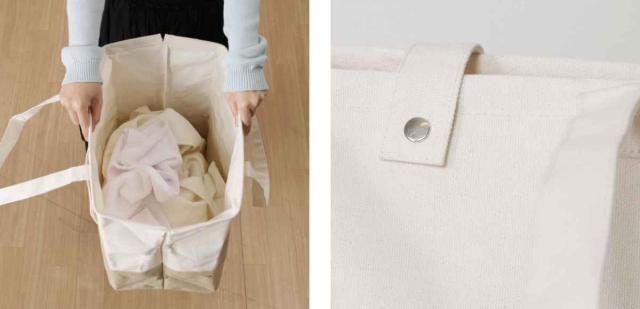 | マチが広くて大容量 洗濯物などの出し入れがラクにできます。口を広げた状態での容量が約40Lでファミリーにも使いやすいサイズです。使用しない時はコンパクトに折りたたんで収納できます。 | ボタン付き 口を閉めるボタンが付いているので中身が飛び出る心配がありません。 |