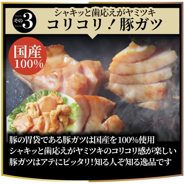 シマチョウ、豚ガツ、牛ギアラ、醤油、砂糖、リンゴ果汁、にんにく、本みりん、レモン果汁、植物油、ごま、玉ねぎエキス、生姜、ネギエキス、酵母エキス、コショー、唐辛子、調味料(アミノ酸等)、増粘剤(キサンタン)、みそ、アミノ酸液、ごま脂、醸造酢、香辛料、酒精(原材料の一部に小麦、大豆、りんご、ごま、豚を含む)