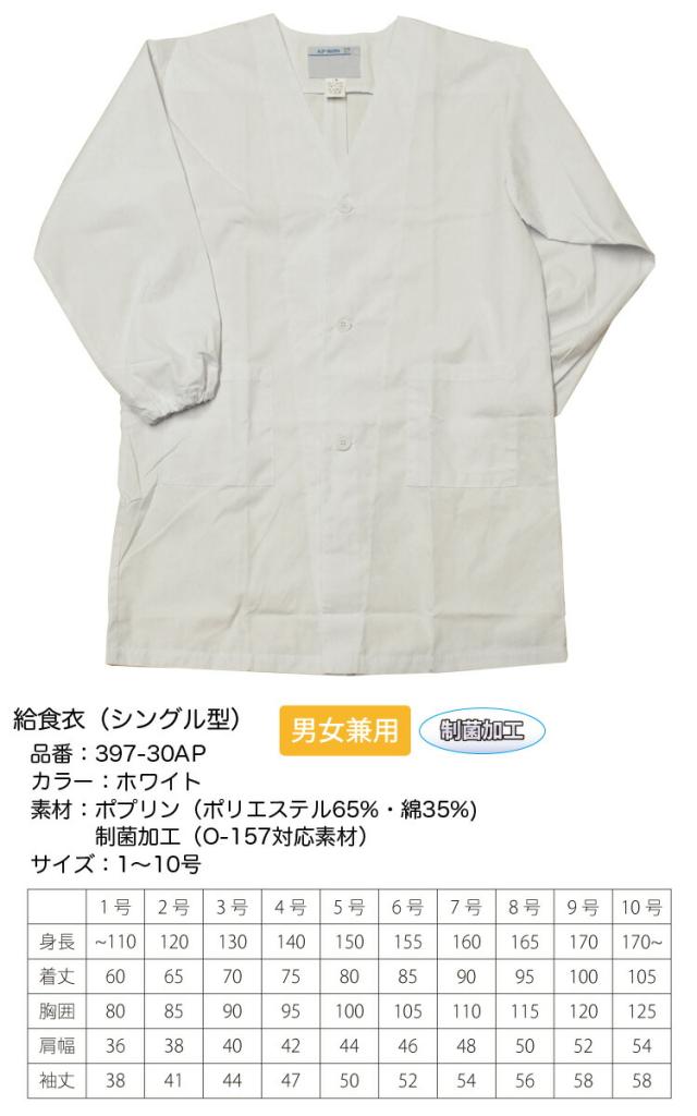 【男女兼用】アプロンアパレル 397-30AP 給食衣(シングル型)白色 給食着 ホワイト 1号〜6号
