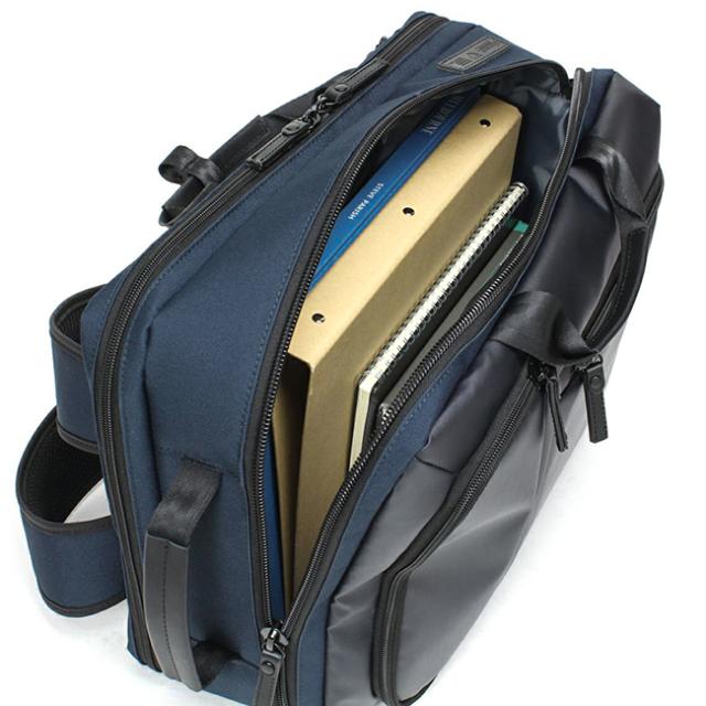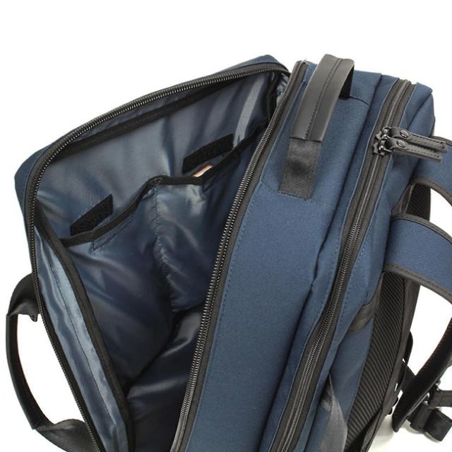 背面側にファスナーポケット×1・その手前にメッシュファスナーポケット×1。リュック時の縦持ち・ブリーフ時の横持ちにしても収納物がバラバラにならないようにポケットはベルクロ付き・ファスナーポケット対応です。