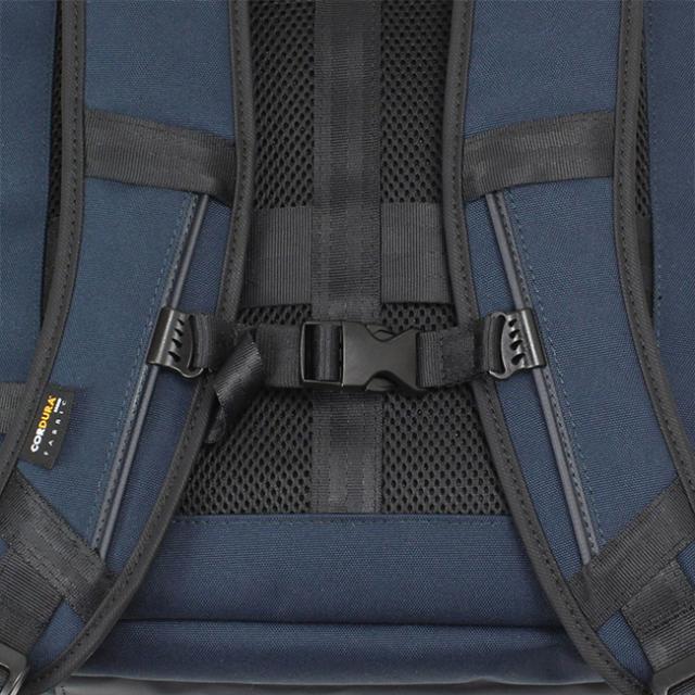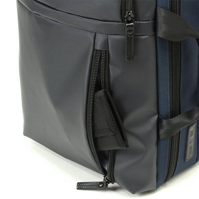 素材には、耐久性に優れた610Dコーデュラポリエステルの生地を採用。はっ水性や防汚性に優れたTPUコーティング加工を施した生地の表と裏の使い分けにより、同系色の落ち着いたデザインでありながら現代的な印象に仕上げられています。本体側面ロゴ部分には質感の高いレザーを採用して、アクセントになっています。背面・肩ベルト裏面は通気性のよいメッシュ構造です。