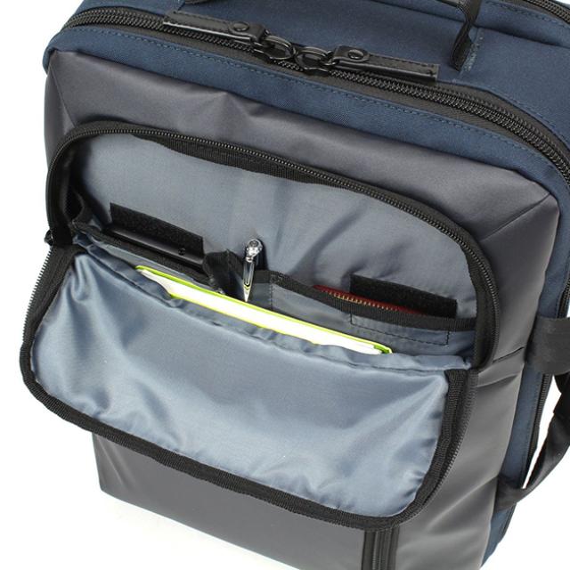 前面上部の前ポケットは、小物の整理に便利なオーガナイザー付き(マチ付きポケット×1・ペン差し×1・ポケット×1)で使い勝手の良い仕様です。ポケットはベルクロ付きでブリーフとしてご使用時もしっかり収納。