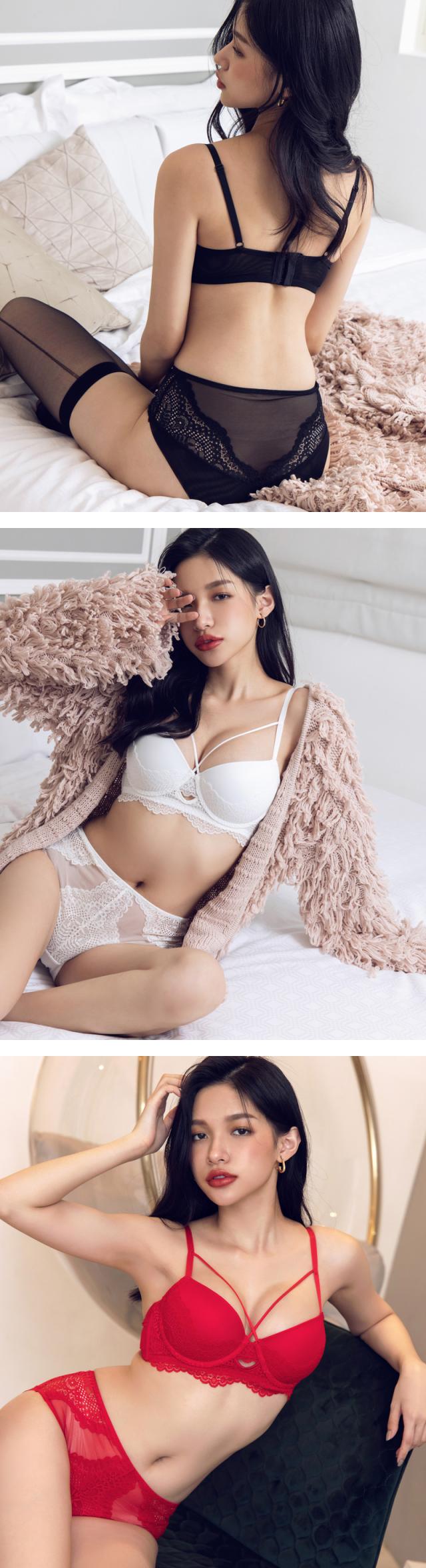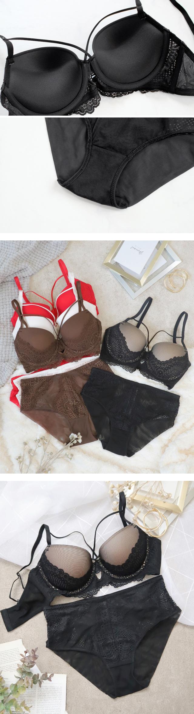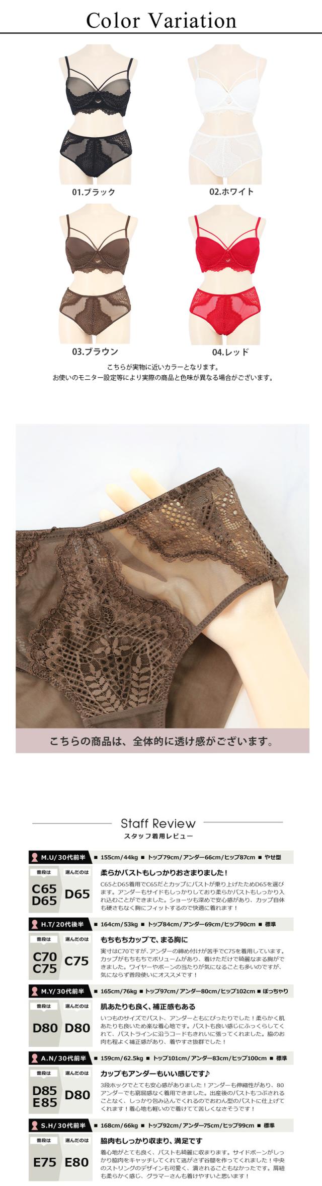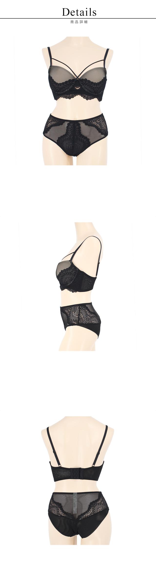 | 優しく編まれたバテンレースと胸元コードの組み合わせがドラマティック。 センターウィンドウが華やぎをプラスし、幻想的な世界へ誘う。 下厚カップinで高さのあるバストメイクもお手の物。 お揃いショーツはレースとシースルーの透け感のあるショーツです。 |