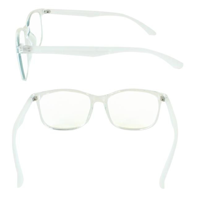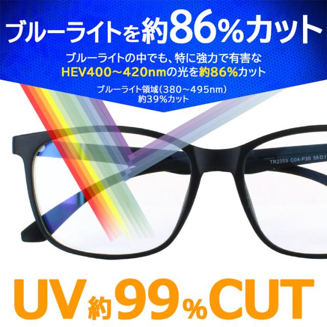 | ●フレームカラー BK ブラック CR クリア BKRD ブラックレッド BRD ブラウンデミ BKGY ブラックグレー CPK クリアピンク CBR クリアブラウン ●レンズカラー(全カラー共通) クリア(ブルーライトカットレンズ) | ●素材 レンズ素材:プラスチック レンズ枠素材:プラスチック テンプル素材:TR90素材 ●仕様 UV99% カット HEV400〜420nmカット率:約86% ブルーライト領域380nm〜500nmの平均カット率:約39% ●可視光線透過率 91% |