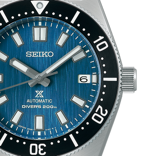 セイコーダイバーズの原点となる1965 ダイバーズをベースにしたモデルは、半世紀を超える歴史や培われてきた技術の積層を、長い時間をかけて形成された氷河と重ね合わせ、ディープブルーのダイヤルとソリッドなブラックのベゼルで表現しています。