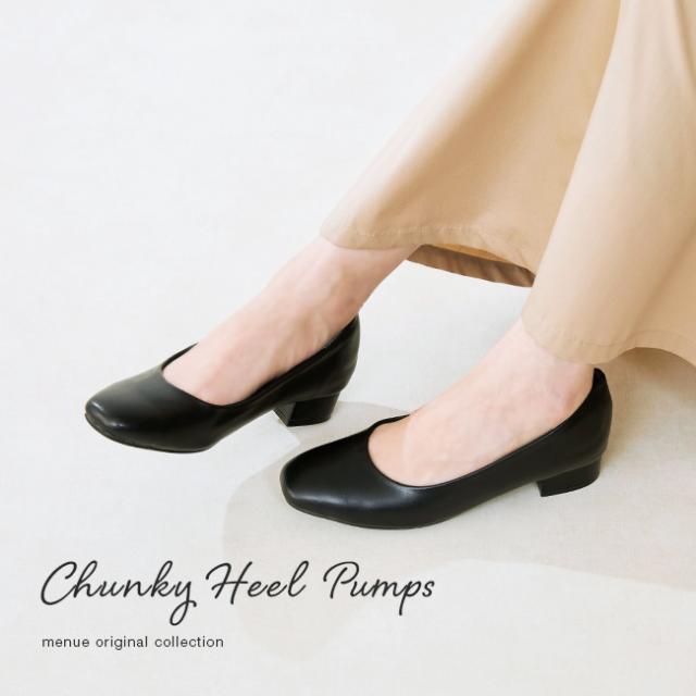 『ぴったりサイズで快適な足元へ! 幅狭スクエアトゥチャンキーヒールパンプス』