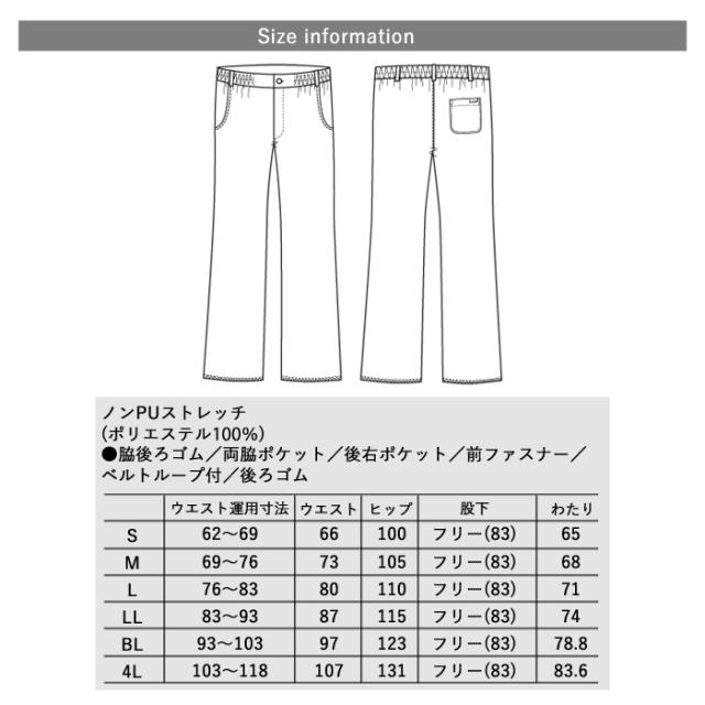 ■機能:脇後ろゴム、両脇ポケット、後右ポケット、前ファスナー、ベルトループ付、後ろゴム
