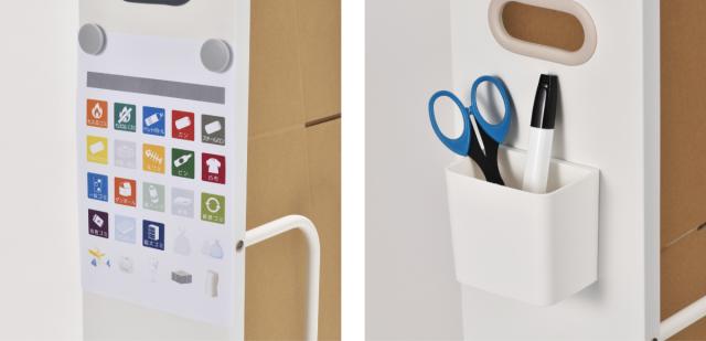 前面の目隠しパネルはスチール製でマグネットを取り付け可能です。ごみ収集カレンダーやメモ、マグネット式の小物入れにハサミやテープなどの梱包道具入れて付けておくと便利です。