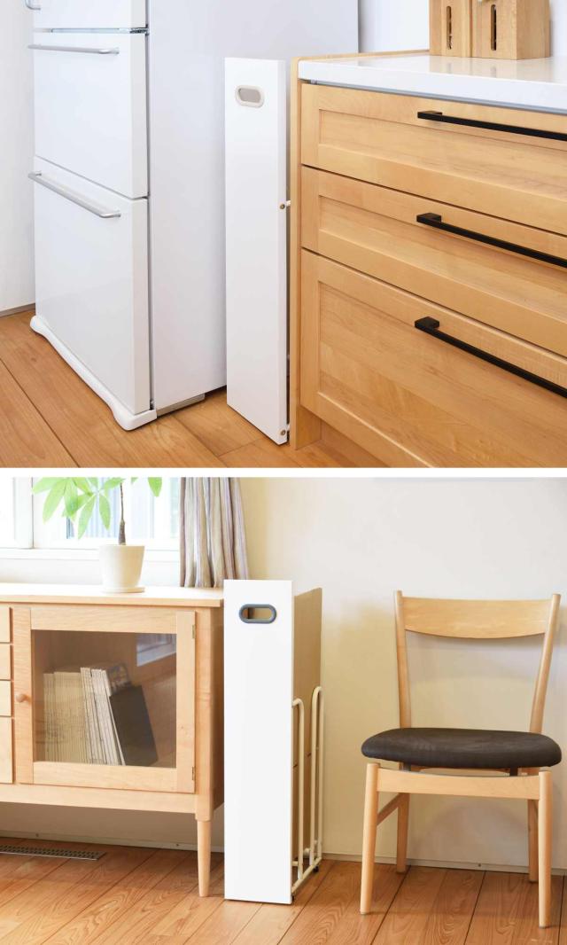 ストッカーの幅はわずか18.8cmとスリムなので、冷蔵庫や食器棚横などのちょっとした隙間スペースにすっぽり収まります。キッチンだけでなく、玄関やリビング、洗面所など今までデッドスペースになっていた様々な隙間を有効活用できます。