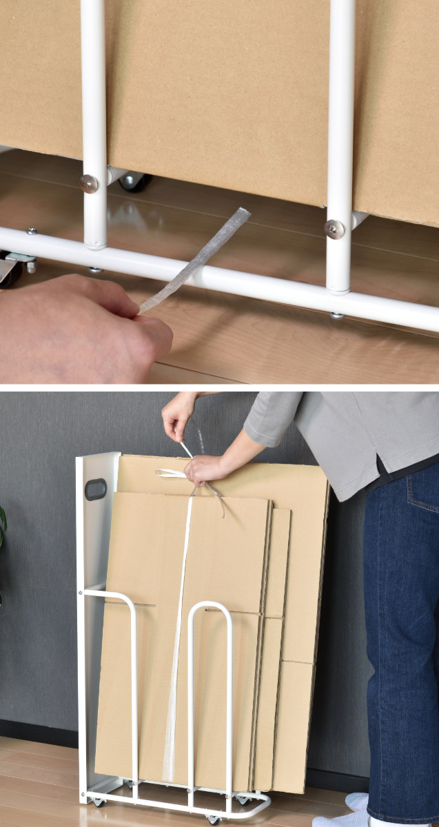 中央下部にあるフレームとダンボールの隙間から紐を通すことができ、ダンボールを収納したまま束ねられます。サイズや形状がバラバラでもズレたり倒れたりすることなく、スムーズにまとめられます。