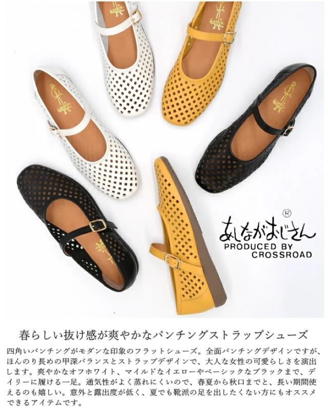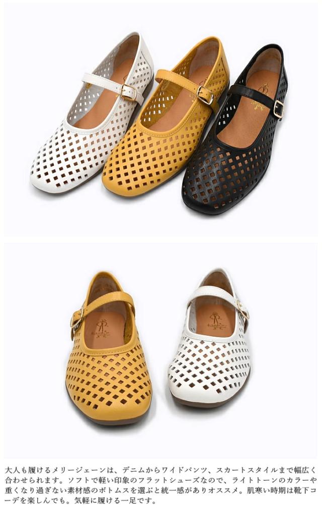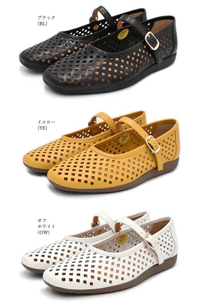 《春らしい抜け感が爽やかなパンチングストラップシューズ》 四角いパンチングがモダンな印象のフラットシューズ。全面パンチングデザインですが、ほんのり長めの甲深バランスとストラップデザインで、大人な女性の可愛らしさを演出します。 爽やかなオフホワイト、マイルドなイエローやベーシックなブラックまで、デイリーに履ける一足。通気性がよく蒸れにくいので、春夏から秋口までと、長い期間使えるのも嬉しい。