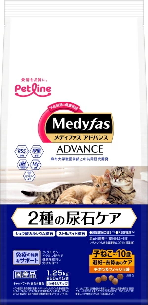 「下部尿路の健康維持」に加え「腎臓の健康維持」や「食物アレルゲンケア」など、様々なニーズに対応しする「メディファスアドバンス」。蓄積された研究データによる『RSS管理』と『尿量の確保』設計により「シュウ酸カルシウム結石」と「ストルバイト尿石」の2種の尿石に配慮。避妊・去勢後の愛猫に、カロリーと脂質を調整。尿pH設計値6.2〜6.5。マグネシウム含有量0.09%(標準値)