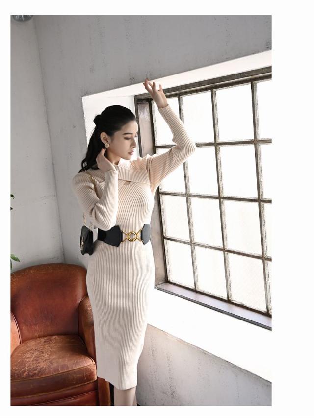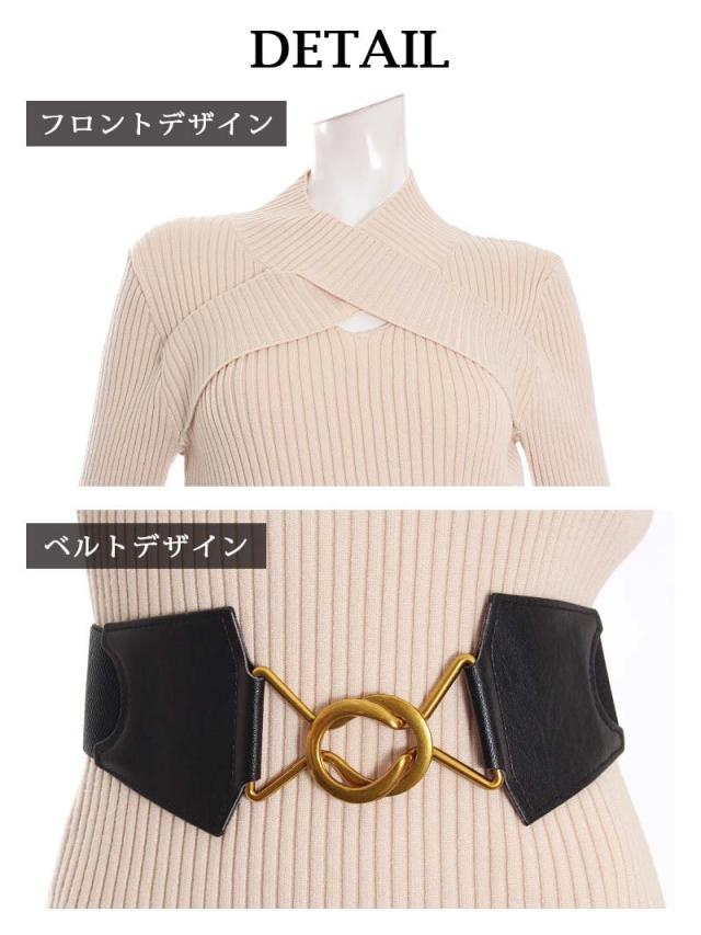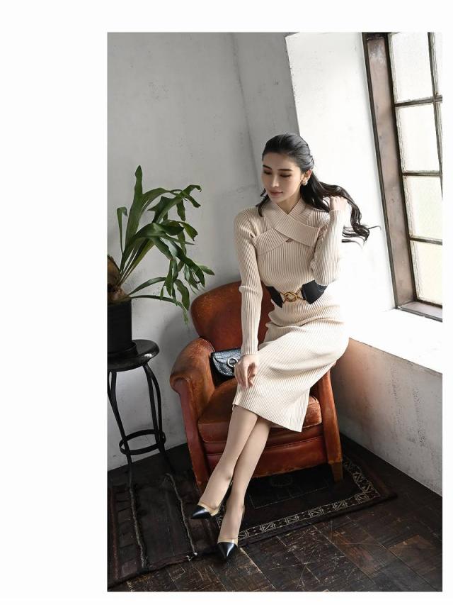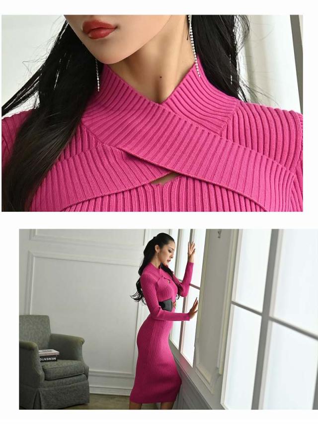 ☆ネックのクロスデザインがエレガントでセレブ風なハーフハイネックのニットワンピース♪