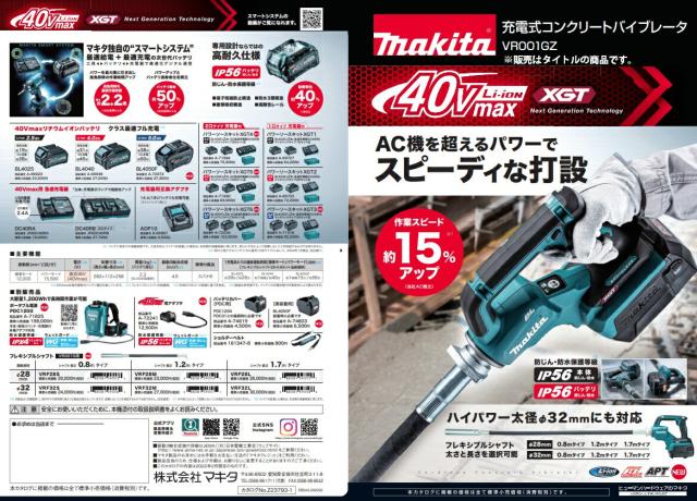 (マキタ) 充電式コンクリートバイブレータ VR001GZBM 本体+1.2mフレキシブルシャフトVRF32M付 振動部径φ32mm 40Vmax対応 makita 大型商品