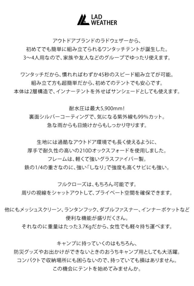 LAD WEATHER ラドウェザー 3?4人用 45秒で組み立てられるワンタッチテント