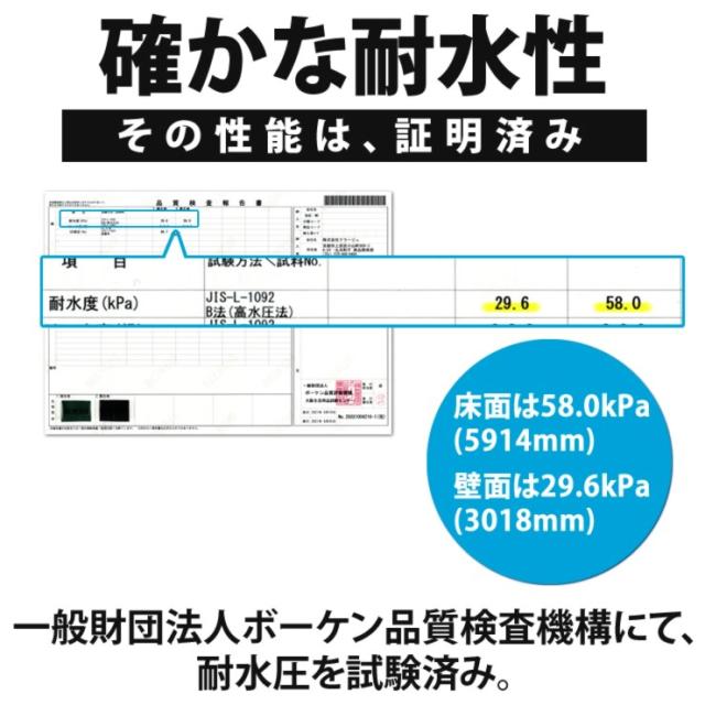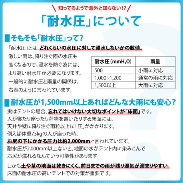 耐水圧が2,000mm以上ないと、地面の水がテント内に染みこんで
