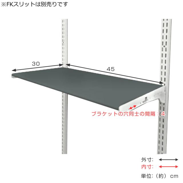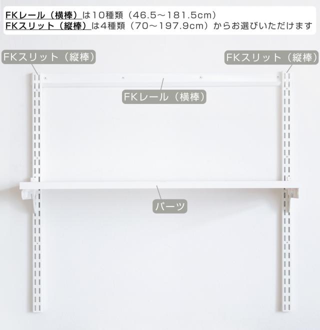 フィットラックは別売りのFKレール(横棒)とFKスリット(縦棒)の両方を壁に設置して、FKスリットにパーツを取り付けます。パーツとなるシューズ用棚の幅は【45・60・75cm】の3種類で、収納スペースに合わせて選べます。高さは2.5cm間隔で、収納物や収納場所に合わせて調整できます。