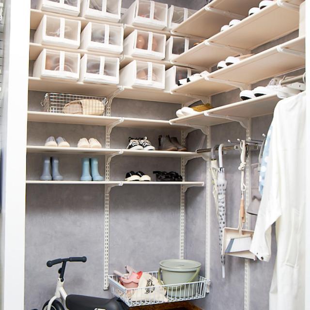 シューズクロークとして玄関先での使用に特化した汚れに強いシンプル棚です。収納スペースを拡大させたい・新たに作りたい方におすすめです。