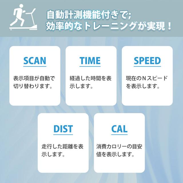 【計測機能付きモニター】走行時間や速度、距離、カロリーなどを自動で計測してくれるので、トレーニングの目安にすることができます。 自動計測機能付きで 効率的なトレーニングが実現!