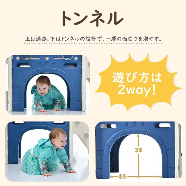 【通路&トンネル】上は通路、下はトンネルの設計で、一層の面白さを増やす。 遊び方は2way!長くて広いスペースで、子どもを這いじさせても歩かせてもOK!