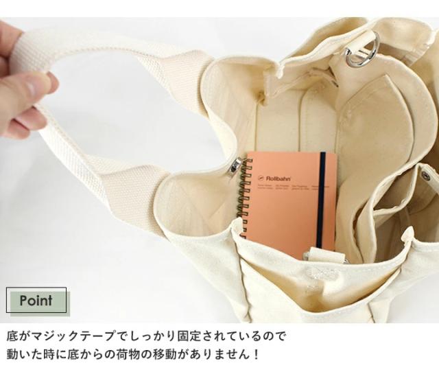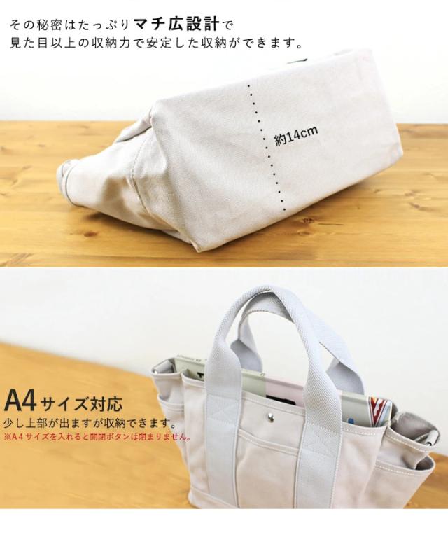 - ミニトートバッグより一回り大きいのを探してて。ちょうど大きさもいいし。生地もしっかりしていて、底もマジックテープで止めれるので荷物が動かないのがいいです。良い商品が買えて満足です。