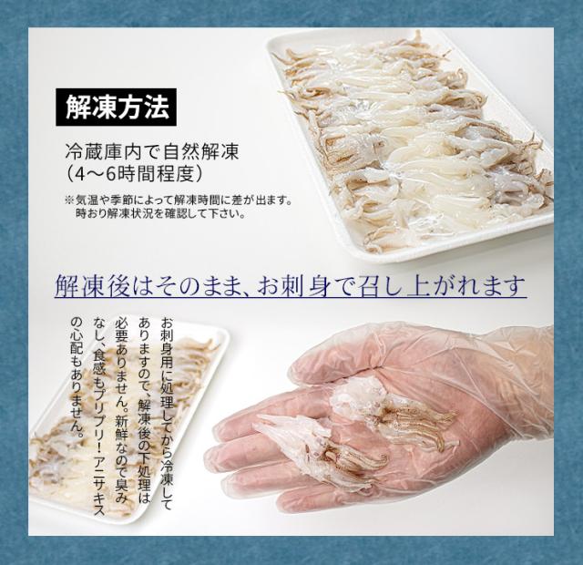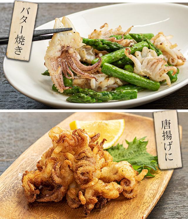 お刺身用のヤリイカのゲソを使用、急速冷凍しました。鮮度抜群なのでコリコリ&プチプチとした食感、噛むほどにイカの甘みが口いっぱいに広がります。冷蔵庫で自然解凍するだけでお刺身が手軽楽しめます。お刺身はもちろん、バター焼き、唐揚げ、アヒージョなどでも美味しく召し上がれます。 |