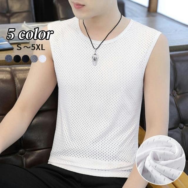 タンクトップ メッシュ ノースリーブ トップス メンズ 男性 紳士 ラウンドネック 通気性 無地 単色 シンプル スポーツ フィ