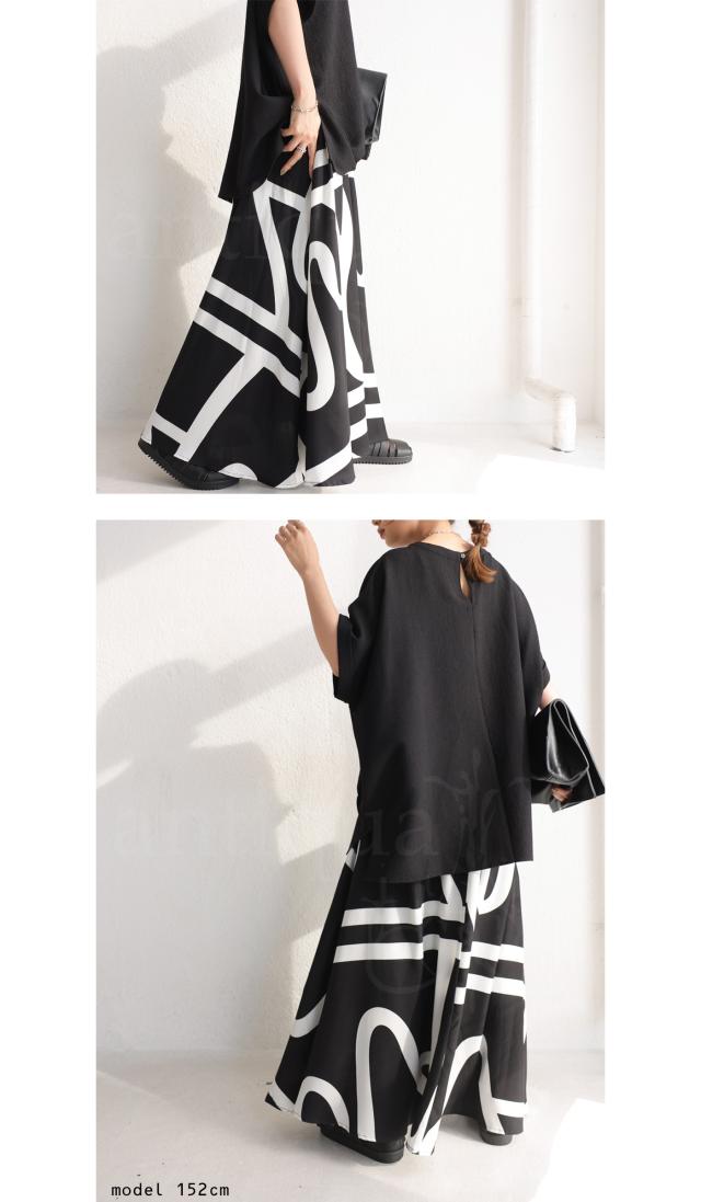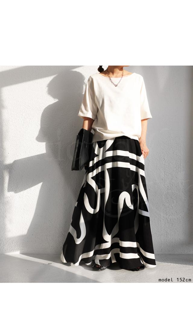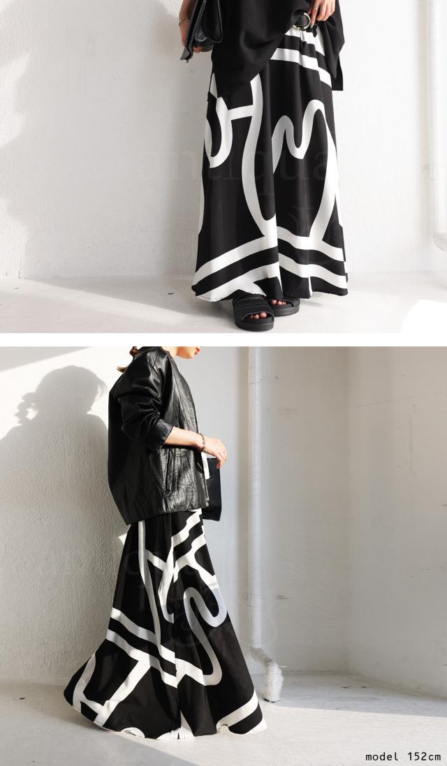 py-00603 ボトムス ロング 柄スカート モノトーン フレア ロングスカート マキシ丈 ウエストゴム 裏地付き 落ち感 モード ゆったり 大きいサイズ