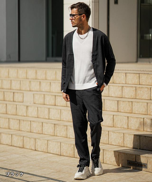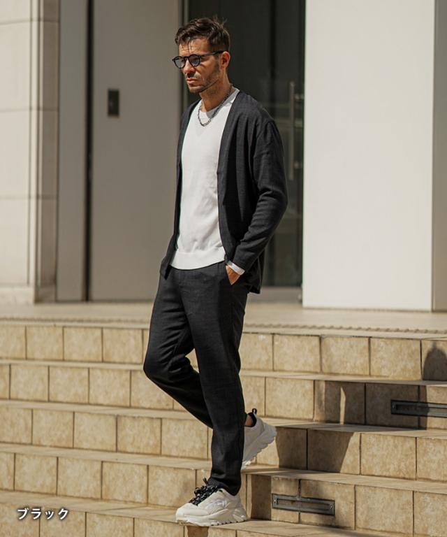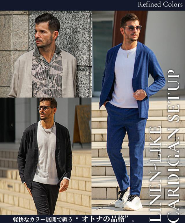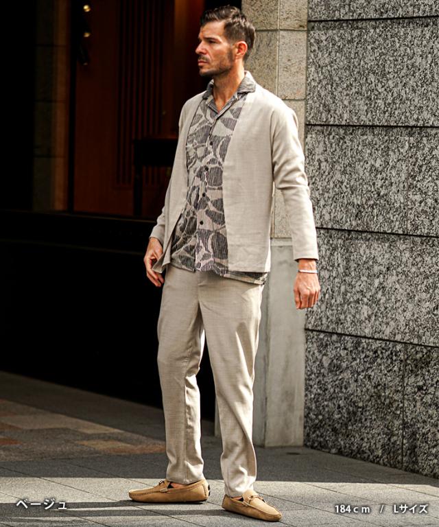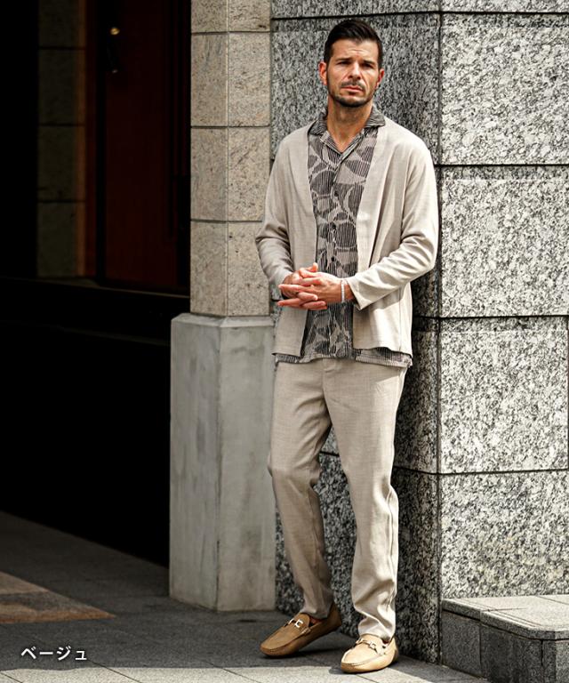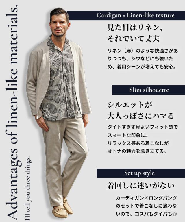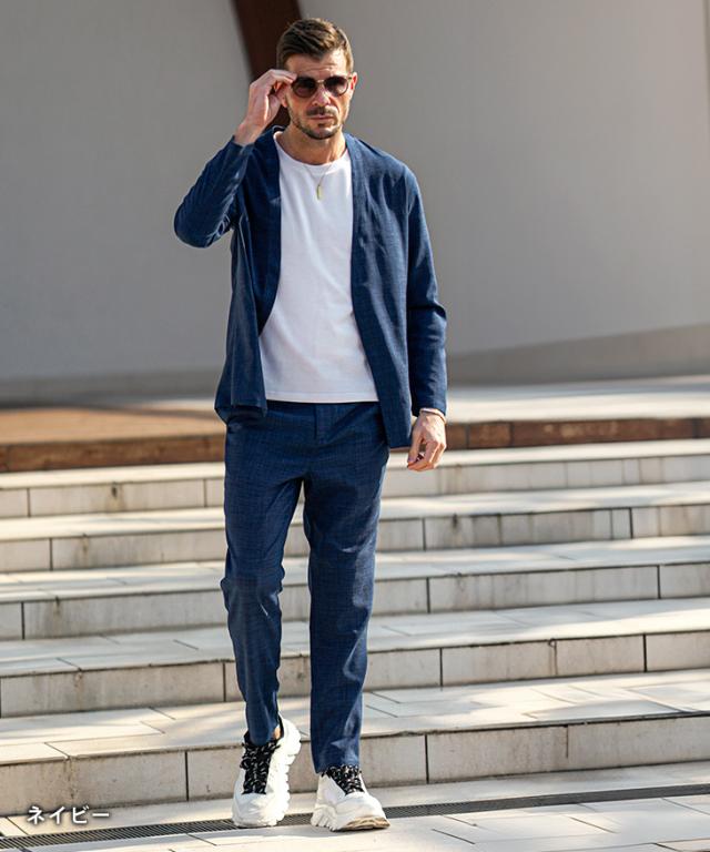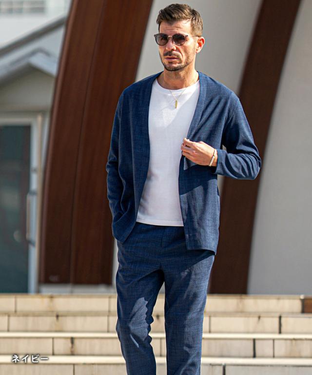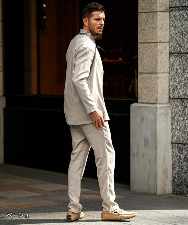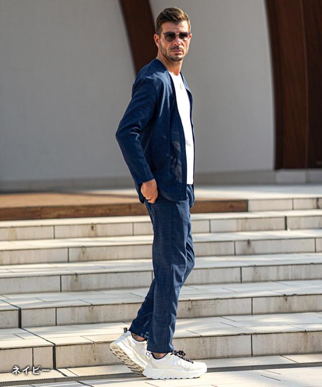 フェイクリネンと言われる麻風に仕立てられた生地を使用したジャケットとパンツのセットアップが登場。【軽やかに、そして爽やかに】余裕のある男、つまりオトナの男はいつも軽快。そして、その軽快さが爽やかさを演出する。フェイクリネンと言われる麻風の生地を使用し、触れると麻のように軽やかでハリがありつつも、ポリエステルの柔らかい肌触りが病みつきになるセットアップ。カラー展開は、アイボリー、ベージュ、ネイビー、ブラックの4色展開。春夏の季節は軽やかに、そして爽やかに。
