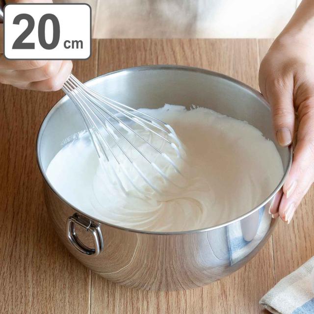 直径約20cmのステンレス製のボールです。ケーキ作り、メレンゲもたっぷり泡立てられる深型です。ステンレス製なので臭い移りも少なく、お手入れが簡単です。耐久性に優れているので長くお使いいただけます。日本製なのも嬉しいポイントです。