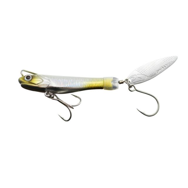 カタクチイワシをデザインベースにしたボディとブレードを持つテールスピンジグ。低重心ワイドボディは圧倒的な飛距離を生むだけでなく、フック絡みを軽減させます。