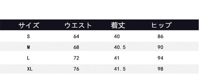 | サイズについての説明 | S ウェスト64 総丈46 ヒップ84 M ウェスト68 総丈46 ヒップ88 L ウェスト72 総丈47 ヒップ92 XL ウェスト76 総丈48 ヒップ96 |