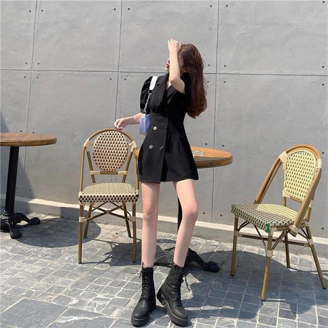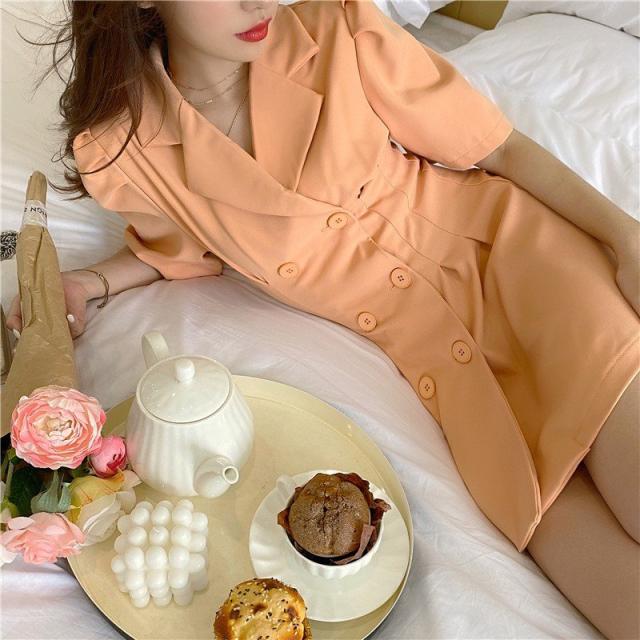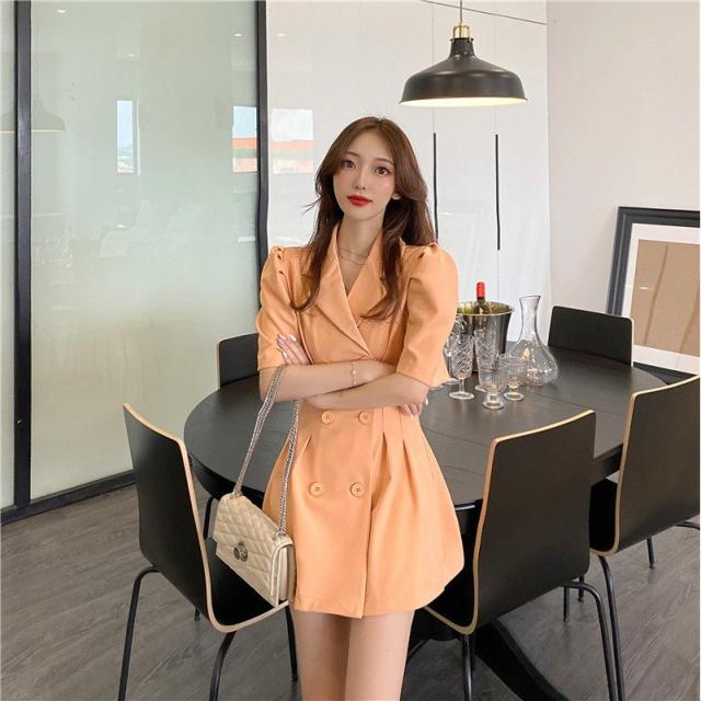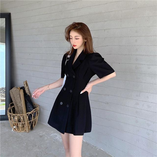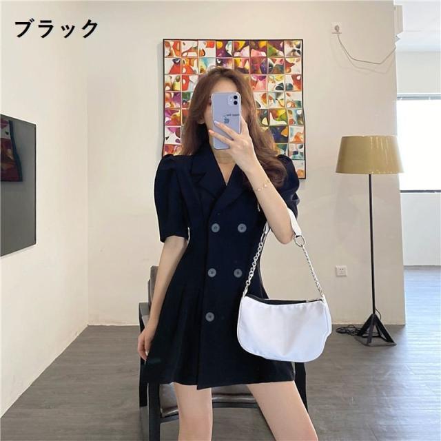 ワンピース 半袖 レディース 女性 婦人 ミニ丈 タイト フレア トレンチ風 Vネック 襟付き パフスリーブ ハイウエスト ダブルボタン セクシー お