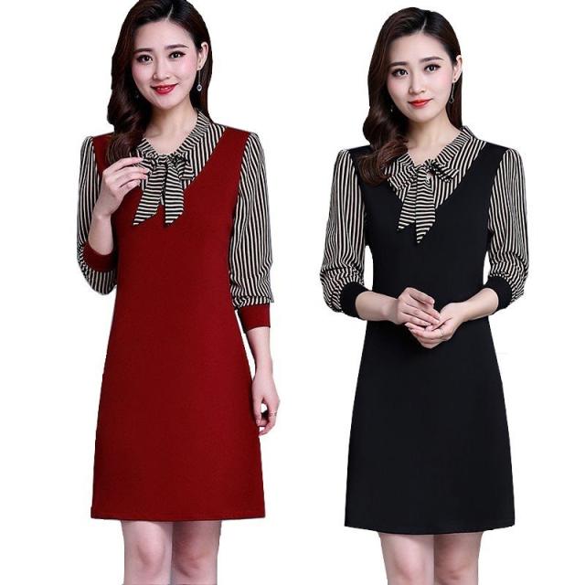 ワンピース 長袖 ミニ丈 ショート丈 ボウタイ 重ね着風 レディース Aライン フレアスカート 切り替え ストライプ 無地 おしゃれ きれいめ 上品