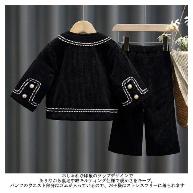| 凛としたブラックのスーツですが、素材感で重くなりすぎず、春らしい軽やかさも感じられる仕上がりになっています。 生地もは上下ともブラックの生地を使用しており、フォーマルなシーンもばっちり対応♪ おしゃれな印象のラップデザインでありながら裏地中綿キルティング仕様で暖かさをキープ。 パンツのウエスト部分はゴムが入っているので、お子様はストレスフリーに着られます。 入学式や卒業式、発表会、ハレの日にぴったりなセットアップアイテムでとびっきりのお洒落コーデを楽しめちゃう!! | |