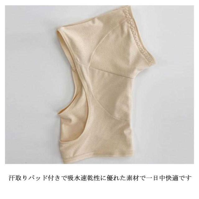 | 暑くなると気になるワキ汗がもう怖くない! ワキ部分に汗取りが付いたこだわりインナーでワキの汗ジミを素早く吸収! 汗取りパッド付きで吸水速乾性に優れた素材で一日中快適です。 ワキ汗をしっかりガードして染み出させないから気になるアウターへの汗染みも防いでくれる♪ どんなコーデにも使えるシンプルなインナーで汗取りパッド付きですので、脇汗もしっかり吸収してくれます さらっとした肌触りで暑い時期に大活躍のインナーです。 | |