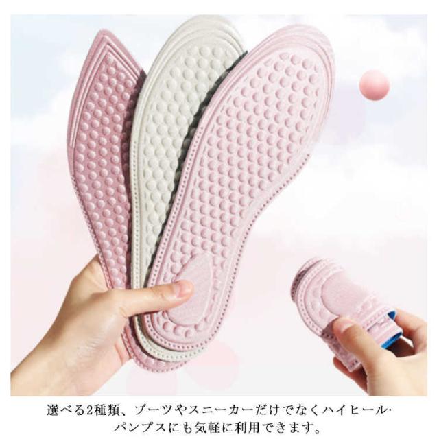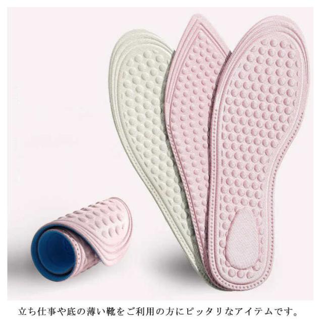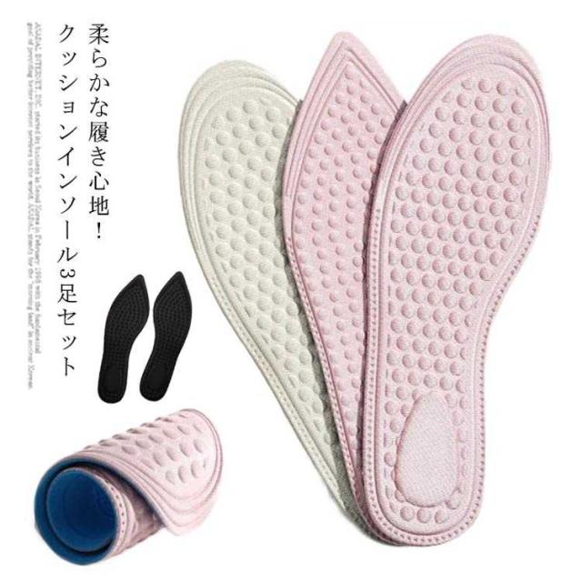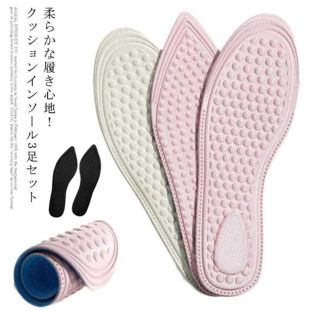 | 柔らかな履き心地!クッションインソール3足セット ふかふかの3Dクッションが足への負担を減らして快適! 立体のドット付き、マッサージの同時に滑らず摩擦にも強いです。 選べる2種類、ブーツやスニーカーだけでなくハイヒール?パンプスにも気軽に利用できます。 立ち仕事や底の薄い靴をご利用の方にピッタリなアイテムです。 | |