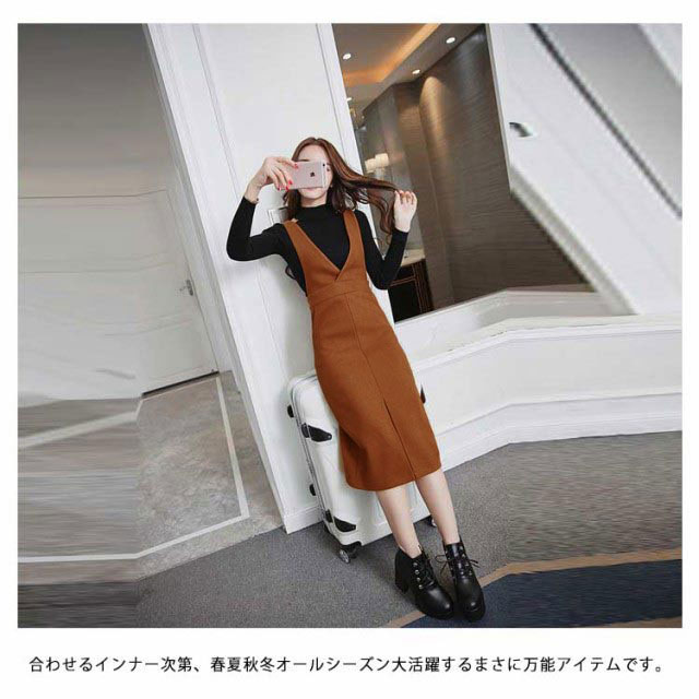 | 細見え効果が期待できるながらも、お腹まわりが楽ちんな大人女子のジャンパースカートです。 インナーにリボンブラウスやハイネックニット、ノースリーブやTシャツなど色々なアイテムにマッチ! 合わせるインナー次第、春夏秋冬オールシーズン大活躍するまさに万能アイテムです。 ハイウエストとフロントスリットデザインで脚長効果! これ一枚で大人かわい、キレイな開きの深めVネックで、フェミニンな印象に、美しいシルエットを実現します。 | |