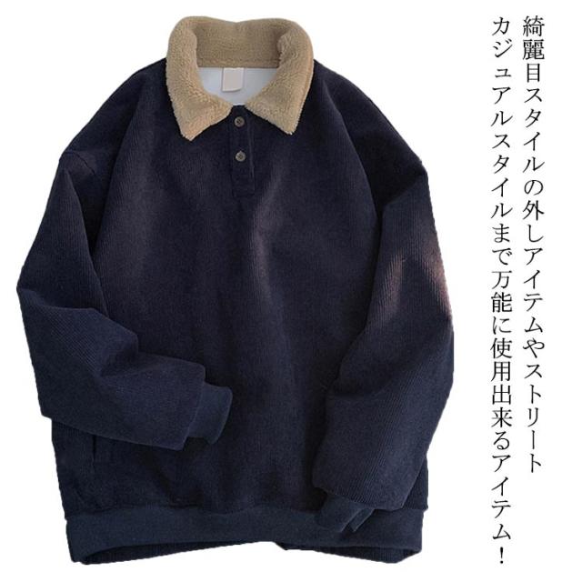 やや厚手 襟付き パーカー トレーナー スウェット 裏起毛 メンズ 無地 ボア襟 レディース ゆったり 紺 コーデュロイ ネイビー 微起毛 ライトベージュ 春 秋冬 ハーフボタン ユニセックス 配色